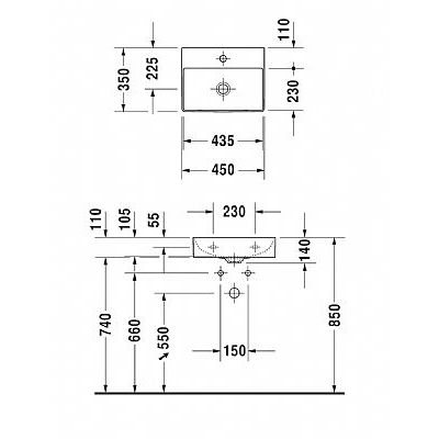 Duravit DuraSquare Håndvask uden Hanehul 450 mm x 350 mm Inkl bundventil med keramisk skjuler.