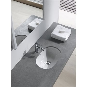 Elegant underlimningsvask, hvor håndvasken integreres i din bordplade. Selve vasken limes op under bordpladen, og der er ikke nogen kant omkring vasken i dit badeværelse. Vi anbefaler, at monteringsformen udføres af fagmand.