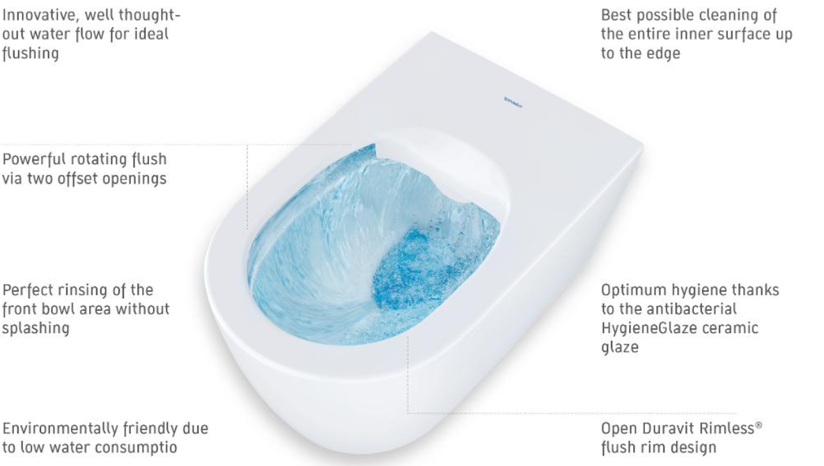 To forskudte åbninger sikrer, at vandet sættes i kraftigt rotation hvorved toilettes indre overflade rengøres optimalt.