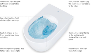Toilettet er med åben skylle-rand (Rimless) hvilket betyder, at skyllekanten er fjernet, så skidt og snavs ikke længere kan gennem sig under denne. Dette øger rengøringsvenligheden væsentlig.
