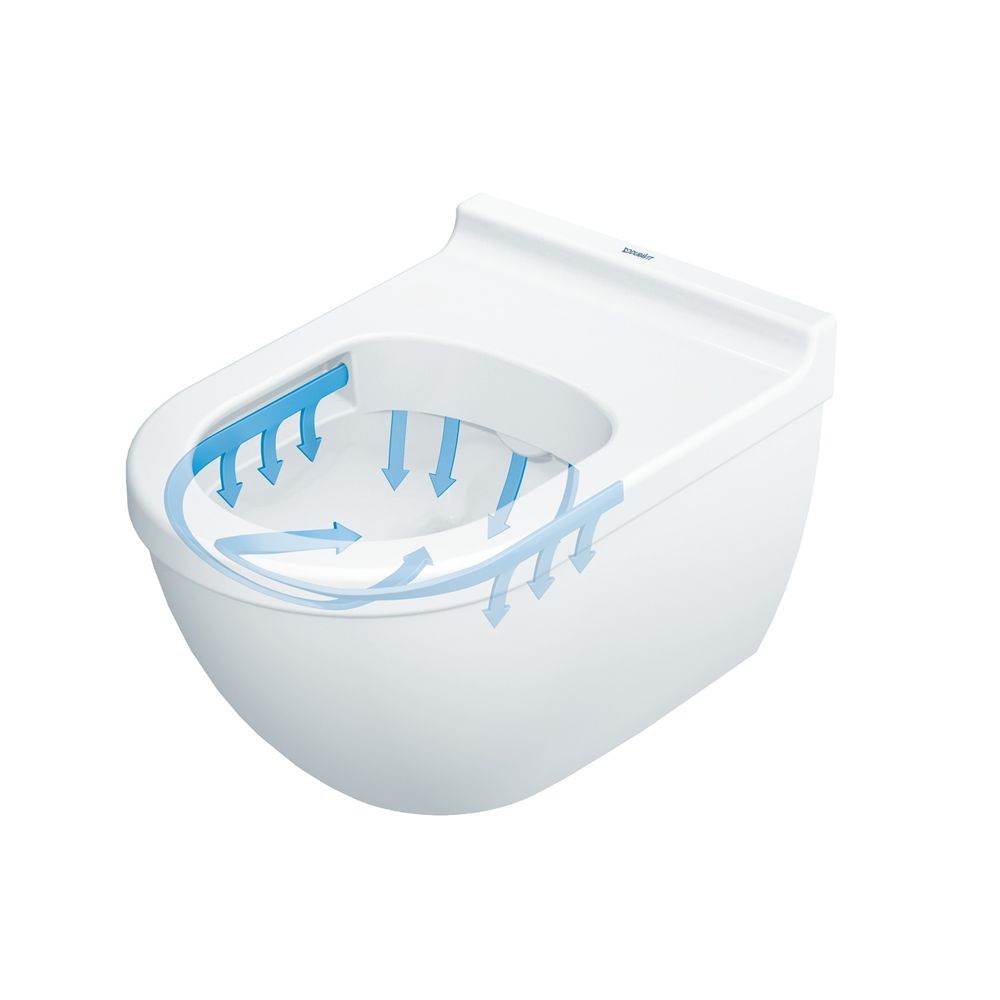 Toiletter fra Duravit med åben skylle-rand (Rimless) betyder, at skyllekanten er fjernet, så skidt og snavs ikke længere kan gennem sig under denne. Dette øger rengøringsvenligheden væsentlig.