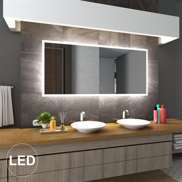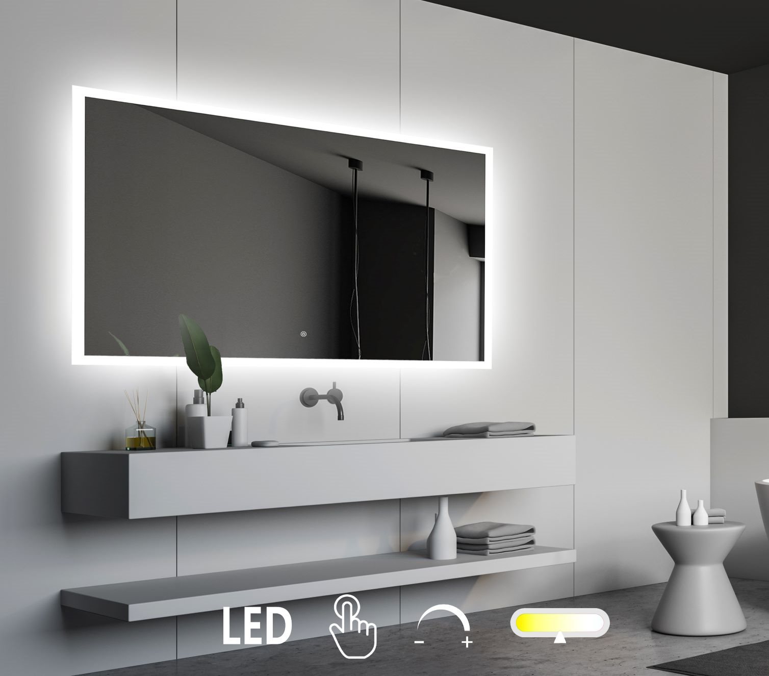 Firkantet spejl med LED lys, front og back & lysstyring 120 x 80 cm. Spejlet er lavet af belgisk AGC MIROX eco glas.