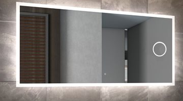 Dette firkantet spejl med integreret LED front lys, har integreret kosmetikspejl med forstørrelse x 5 Ø14 cm og baggrundsbelysning. På fronten er der en integreret Touch switch/knap via denne betjenes alle LED lys indstilling som er.: