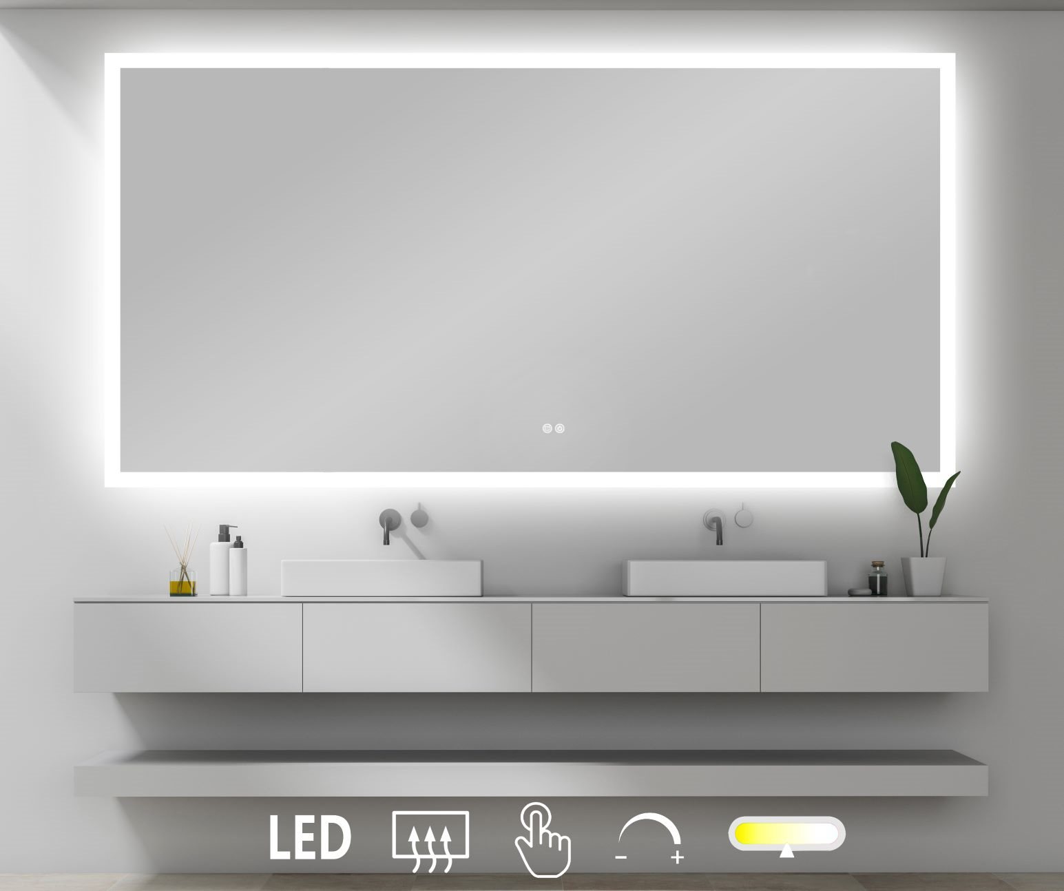Dette elegante spejl har integreret front og baggrundsbelysning, på fronten er der integreret Touch switch med tænd og sluk samt mulighed for at justere lysets styrke fra 3000K optil 6000K. En anden feature er den indbygget anti-damp funktion, denne aktiveres ved touch-funktion, herved undgår du damp på spejlet når du har været i bad.