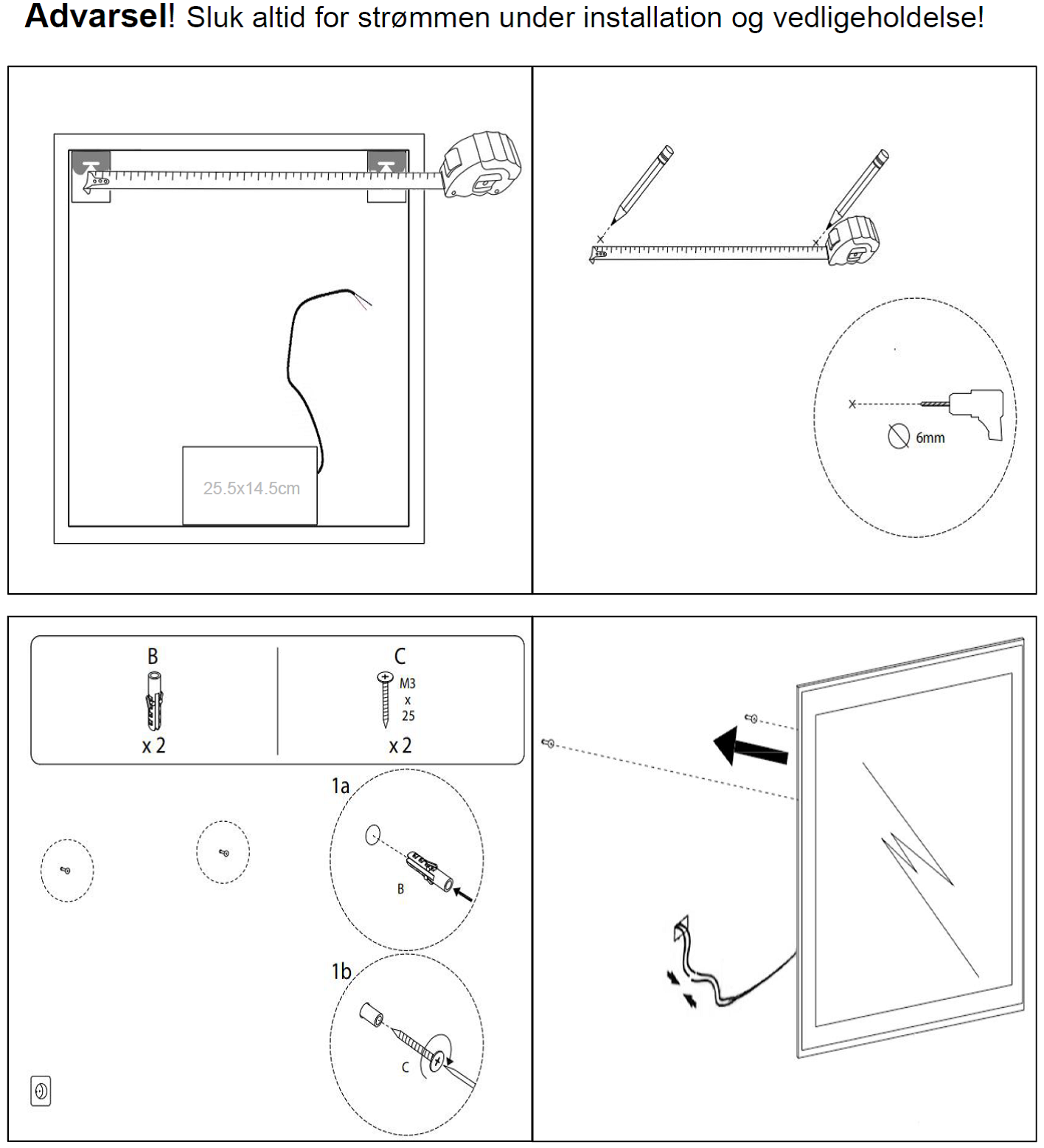 Spejlet ophænges på væggen ved, at skrue to skruer i væggen, herpå hægtes ophængsbeslagene der er fastgjorte bagpå spejlet. Al elektronik, herunder LED drivere m.m. er formonteret på spejlets bagside, det medfølgende kabel tilsluttes direkte til 230V.
