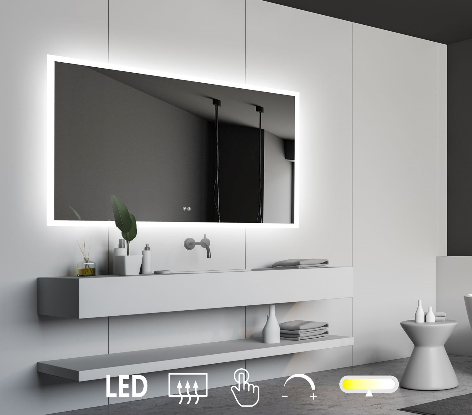 Firkantet spejl med LED lys, front og back, lysstyring og anti-damp. Spejlet er lavet af belgisk AGC MIROX eco glas.