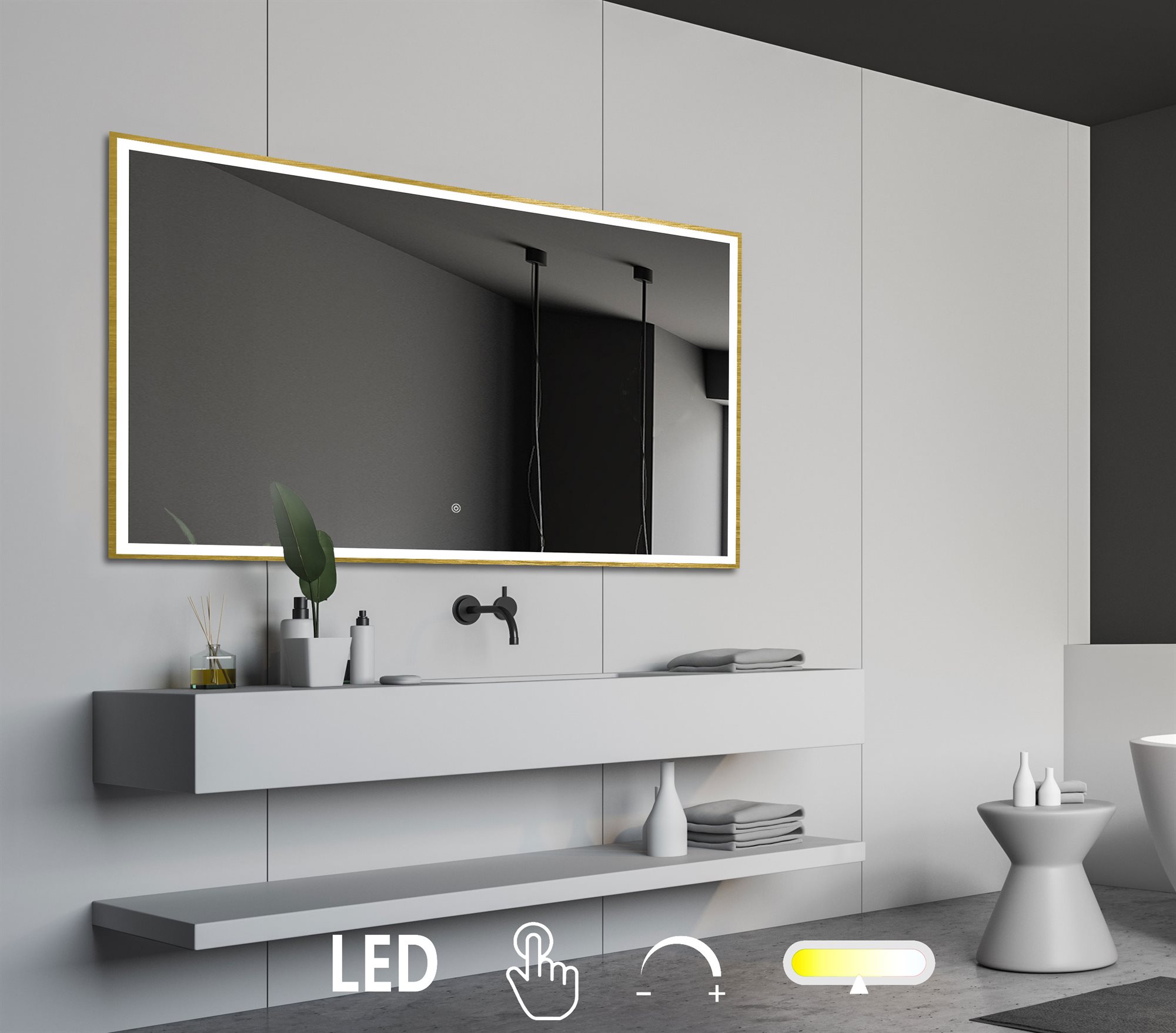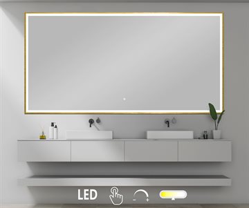 Spejlet har integreret LED lys og en børstet rosaguld alu-ramme, på fronten er der integreret Touch switch/knap via denne betjenes alle LED lys indstilling som er.: