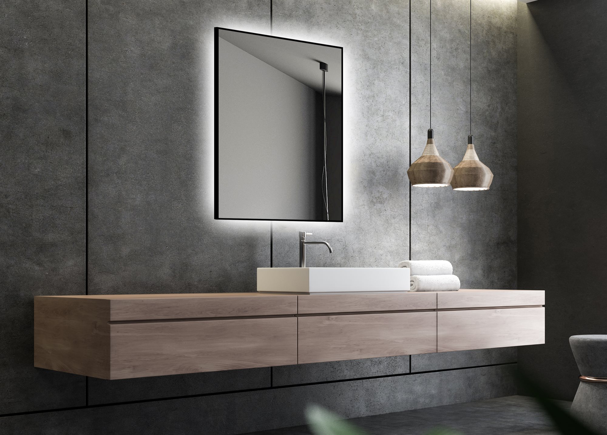Firkantet Spejl med Integreret Sort Ramme og LED Baggrundsbelysning