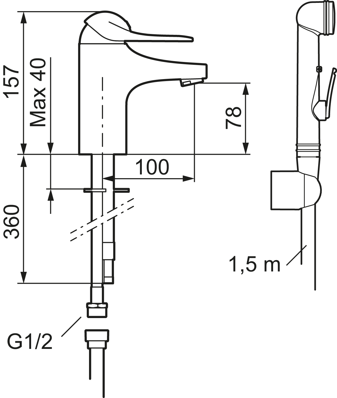 Med selvlukkende håndbruser, ophæng, 1500 mm slange.
