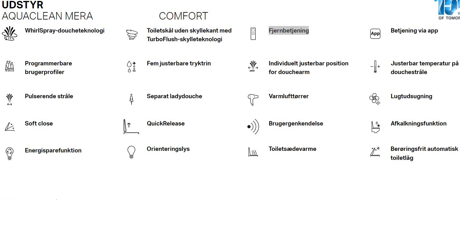 Aquaclean Mera Comfort douchetoilet (et toilet med bidetfunktion), er Geberit´s topmodel, det er ikke kun et skylle/tørre-toilet. Her får man alt hvad man kan ønske sig indenfor toilet hygiejne, komfort og bekvemmelighed. Tag bare, varme i sædet, berøringsfri åbning og lukning af toiletsædet, orienteringslys under skålen, WhirlSpray-doucheteknologi, tørrefunktion og meget mere. Udover de mange funktioner har Geberit Aquaclean Mera Comfort et design som passer ind i ethvert badeværelsesmiljø.