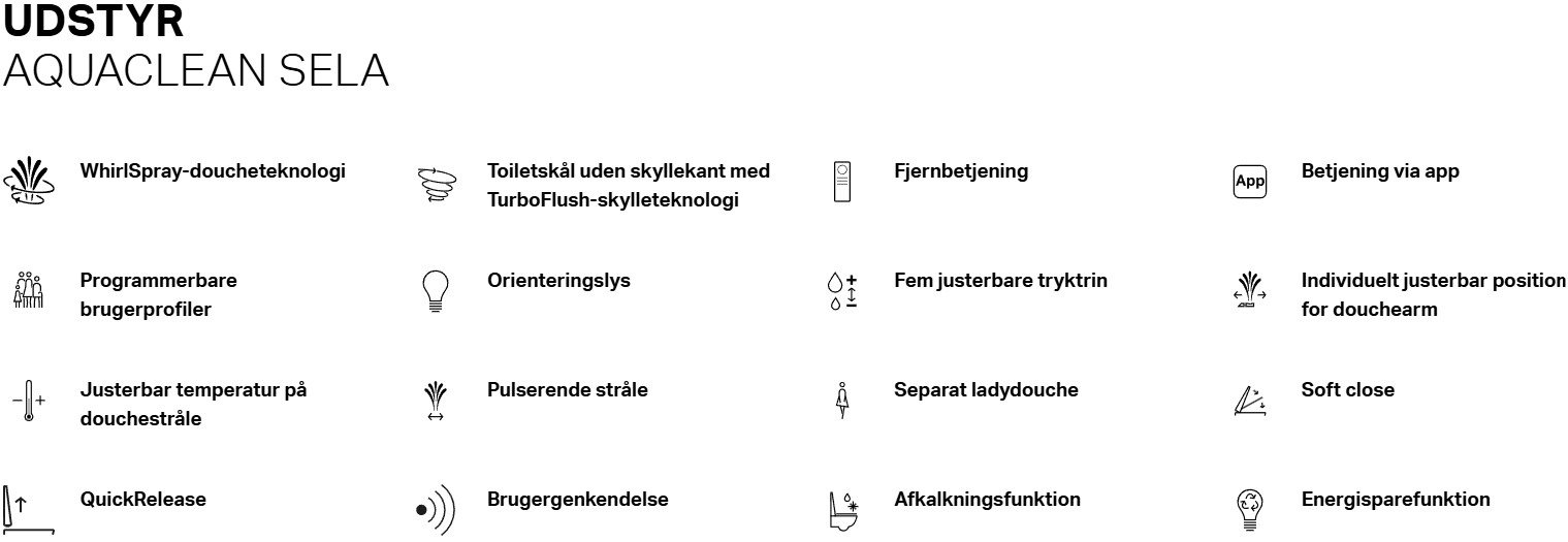 AquaClean Sela kommer med den smarte WhirlSpray-doucheteknologi, der rengør dig efter toiletbesøg og har herudover en separat ladydyse til nænsom rengøring med vand i vaginalområdet. Den støjsvage TurboFlush-teknologi sikrer en effektiv og grundig skylning af toiletskålen. Douchetoilettet har afkalkningsfunktion som sammen med den glatte porcelænsoverflade og QuickRelease hængsler på toiletsædet, gør at toilettet nemt at rengøre.