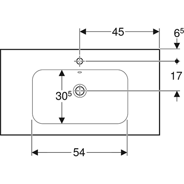 Geberit iCon Light håndvask med fralægningsplads på begge sider af vasken. Vasken er med standard overfladebehandling, hanehul placeret i midten og er med overløb.