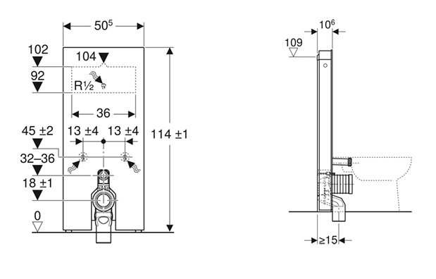 Med Geberit Monolith til gulvstående toiletskåle åbnes der op for helt nye muligheder når det kommer til at inkorporerer strømlinede toiletløsninger i badeværelsesindretningen. Denne Geberit Monolith løsning er designet til at blive tilslutte det eksisterende gulvafløb og den eksisterende vandtilslutningen, uden større byggemæssige indgreb. Denne udgave passer til afløb med en centerafstand fra afløb til færdig væg på 15 cm