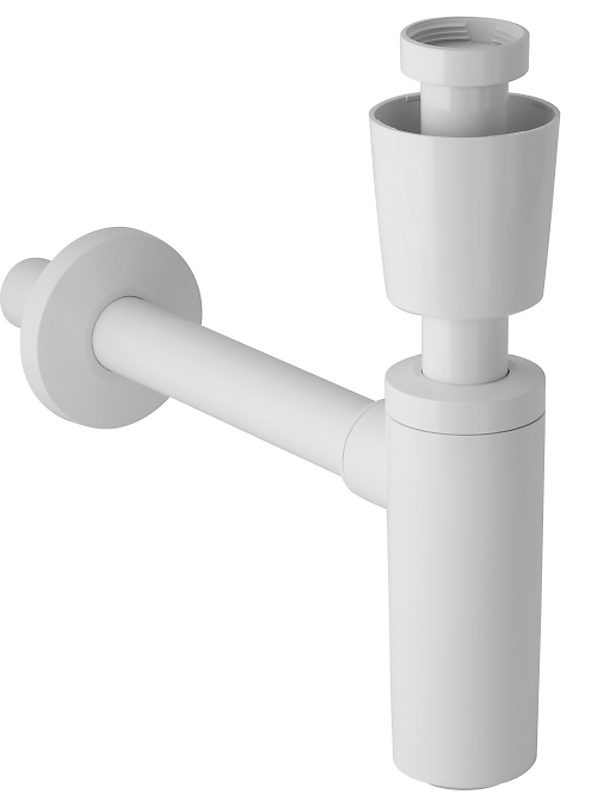 Med højdeindstilleligt tilslutningsrør, afgangsrør og rosetter mod bundventil og væg/gulv.