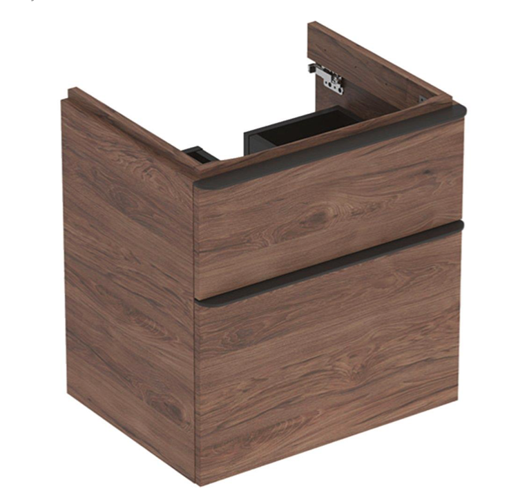 Geberit Smyle Square underskab til håndvask, med to skuffer: B=58.4cm, H=61.7cm, T=47cm, Nøddetræ hickory / melamin træstruktur, lava / pulverlakeret mat