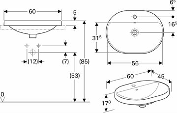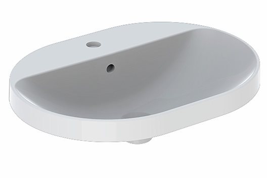 Geberit VariForm nedfældnings håndvask 60 cm elipseformet, med hanehul og overløb. Komplet monteringssæt medfølger. VariForm vaskene Fælles har en meget tynde porcelænskant som indrammer vaskebassinet og giver vaskene et ekslusiv design.
