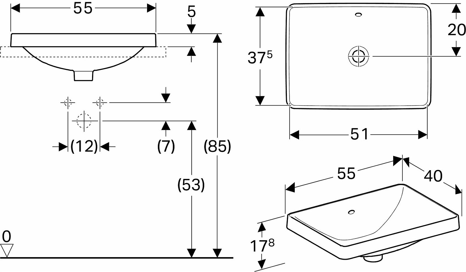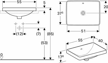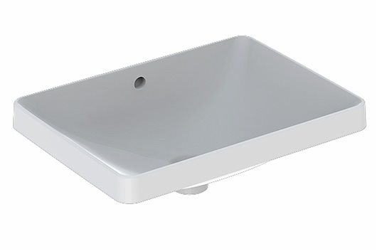Geberit VariForm nedfældnings håndvask 55 cm rektangulær, med overløb. Komplet monteringssæt medfølger. VariForm vaskene Fælles har en meget tynde porcelænskant som indrammer vaskebassinet og giver vaskene et eksklusiv design.