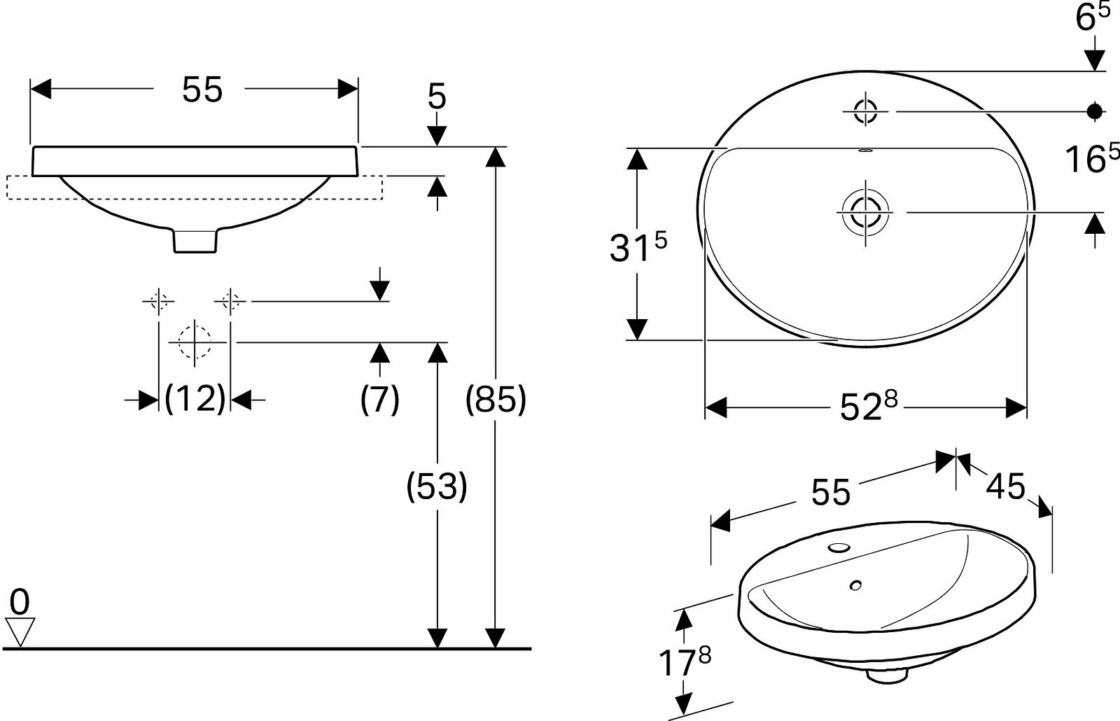 Geberit VariForm nedfældnings håndvask 55 cm Oval, med hanehul og overløb Komplet monteringssæt medfølger. VariForm vaskene Fælles har en meget tynde porcelænskant som indrammer vaskebassinet og giver vaskene et ekslusiv design.