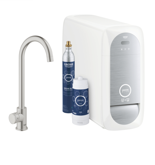 Med GROHE Blue Home Mono Køkkenvandhanen med køler starter kit og C-tud  kan du Tappe filtreret og afkølet vand, med eller uden brus, direkte fra køkkenvandhanen.