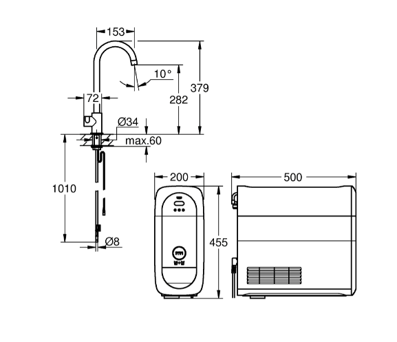 Grohe vandhanen har en høj C-formede tud der giver god plads, når vandkanden skal fyldes med enten almindelig eller brusende vand. Selve køkkenvandhanens tud har et 150 grader svingfelt, hvilket sikrer den fornødne komfort og fleksibilitet.
