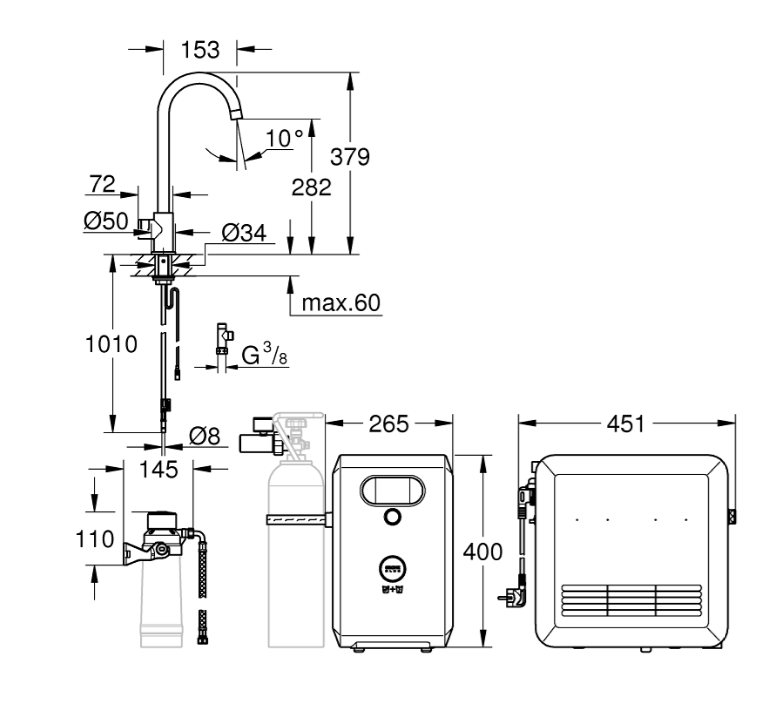• software installation samt monitorering af filter og CO2-kapacitet kan gøres via GROHE Ondus app