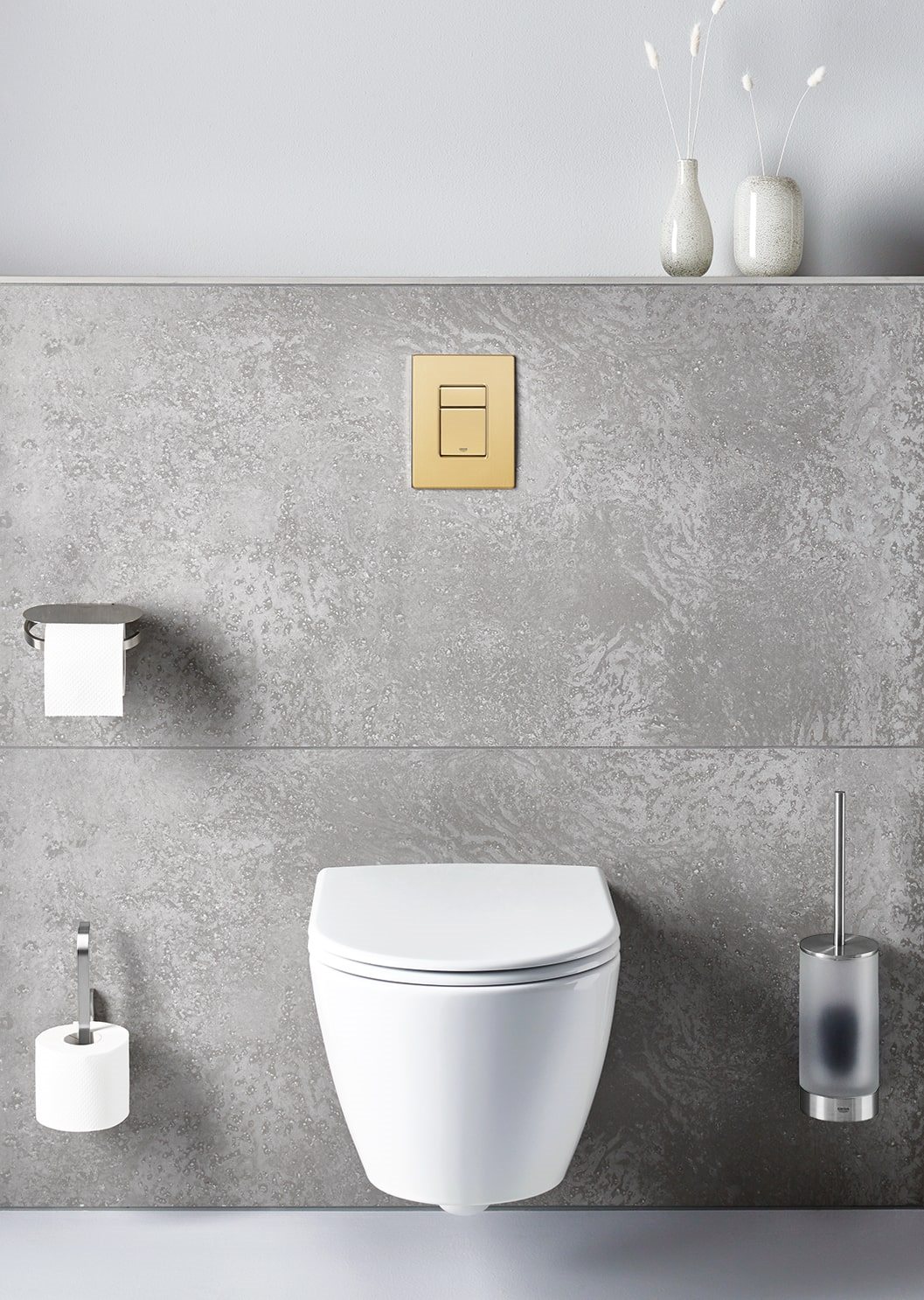 Komplet Grohe indbygningstoiletpakke "alt-i-1" med indbygningscisterne, betjeningsplade i Børstet messing, Essence hængeskål og Soft close sæde