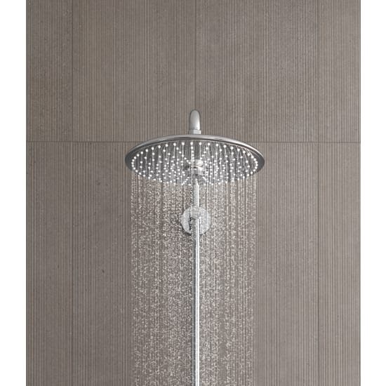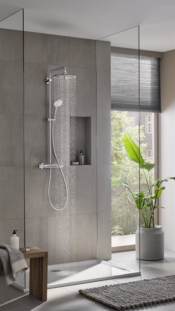 Et GROHE Rainshower 260 vægmonteret brusesystem er komplet og består af et moderne termostatblandingsbatteri som kontrollere vandet og flowet, herpå er der monteret et brusestangssæt bestående af en minimalistisk håndbruser med et multifunktionelt strålemønster og et stort bruserhoved som levere fyldige og bløde brusestråler.