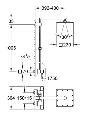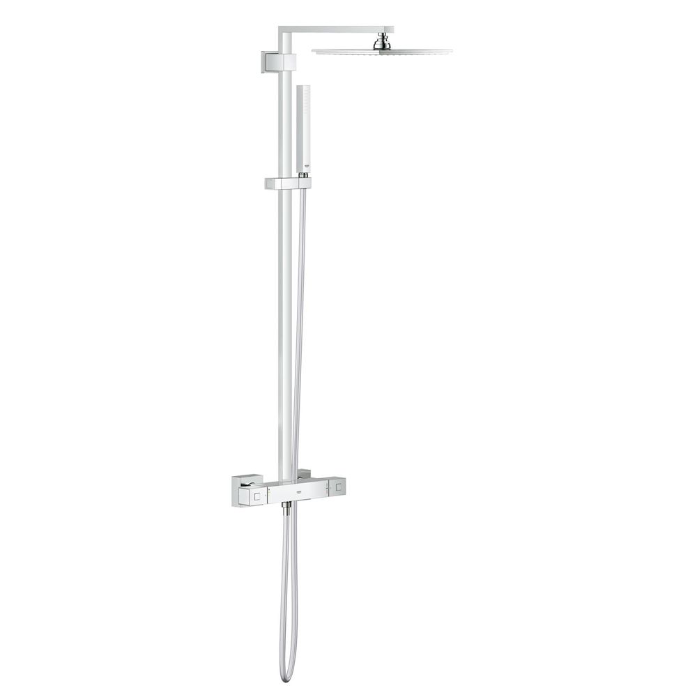 Et Grohe Euphoria Cube 230 termostat vægmonteret brusesystem er komplet og består af et moderne kvadratisk termostatblandingsbatteri som kontrollere vandet og flowet, herpå er der monteret et brusestangssæt bestående af en minimalistisk kvadratisk håndbruser med et multifunktionelt strålemønster og et stort kvadratisk bruserhoved 230 x 230 mm som levere fyldige og bløde brusestråler.