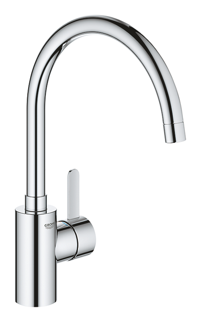 Med Grohe Eurosmart Cosmopolitan får man et moderne design uden overflødige design detaljer. Resultatet er et køkkenvandhane med fokus på det væsentlige, nemlig et funktionelt kvalitets køkkenarmatur der matcher moderne arkitektur. Vandhanen har en høj flot og svingbar C-tud der giver masser af plads til køkkenarbejdet.