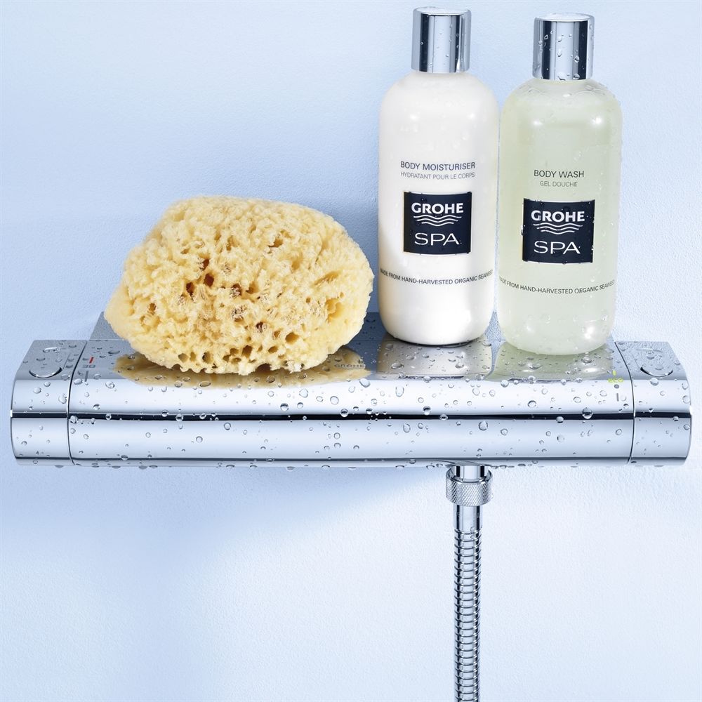 Grohe Grohtherm 2000 brusetermostat har et ekskvisit design med fine detaljer som EasyReach-bruserhylde med integreret opbevaring af shampoo og sæbe, der er let at rengøre og de ergonomiske Aqua Paddle greb, der sikrer ubesværet betjening.