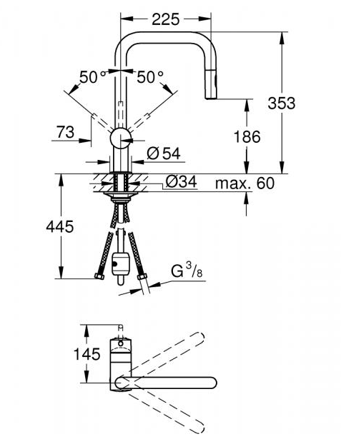 Vandhanen har en høj flot og svingbar U-tud med 50 cm udtræksslange, der er ideel til køkkenarbejde. Den udtrækkelig udløbstud har to forskellige strålemønstre samt automatisk tilbagetrækning af brusehovedet.