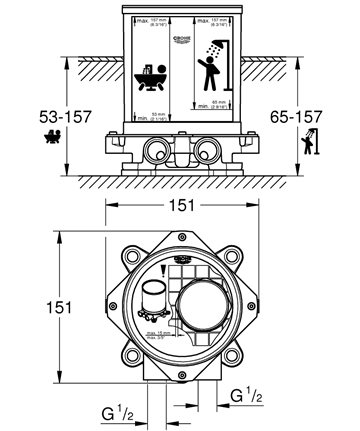 • installationsdybde på 53-157 mm når det glæder badtud eller blandingsbatteri, kompensationsdybde 104 mm