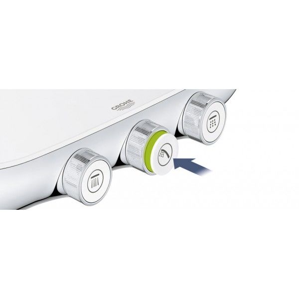Termostaten er med GROHE CoolTouch, som er en teknologi der sikre, at termostatens overflade aldrig bliver for varm at røre ved. Og de mindste familiemedlemmer kan trygt gå i bad, da SafeStop-knappen er indstillet til 38 grader, og forhindrer børn i at skrue op for temperaturen.