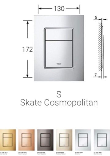 Med Grohe Skate Cosmopolitan S betjeningsplade til aktivering af toiletskyl, får man et moderne design uden overflødige design detaljer. Resultatet er en lille betjeningsplade (Bredde 130 x Højde 172 mm) med fokus på det væsentlige, nemlig en funktionel, kvalitets skylleknap der matcher moderne arkitektur. Skylleknappen er med dobbeltskyl hvilket gør det muligt at vælge en skyllemængde på 3 eller 6 liter (eller 3 og 4,5 liter i visse keramiske kummer), og det er muligt at stoppe et fuldt skyl med en lille knap.