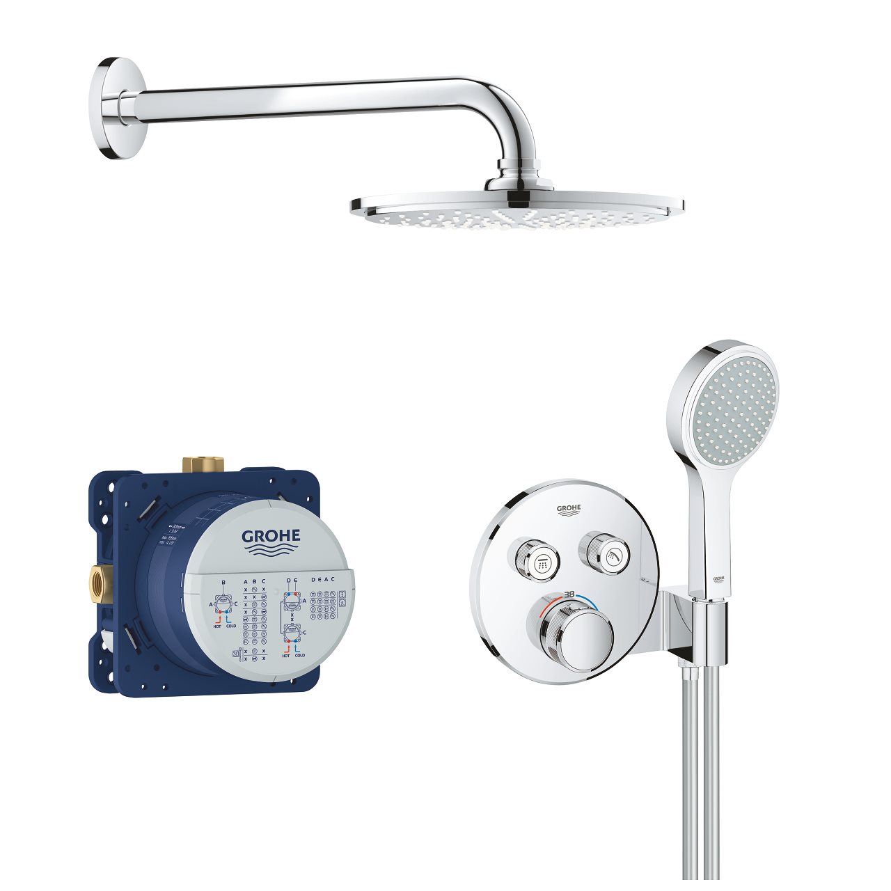 GROHE SmartControl Rainshower termostat indbygningsbrusesystem er komplet og består af en moderne bruse termostat med 2 strålemønstre knapper samt hertil hørende indbygningsdel, en hovedbruser Ø210 mm og Power&Soul Cosmopolitan håndbruser med holder og slange. Det har et kvadratisk og grandiost design i kombination med afrundede elementer og en banebrydende tryk og drej betjenings teknologi af vandmængde og temperatur.