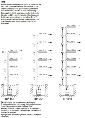 Unilift KP 250 A 1 Kælder- og lænsepumpe Vertikal ettrins-dykpumpe af rustfrit stål med vertikal afgangsstuds og indbygget 1-faset spalterørsmotor i isolationsklasse F med termisk beskyttelse.