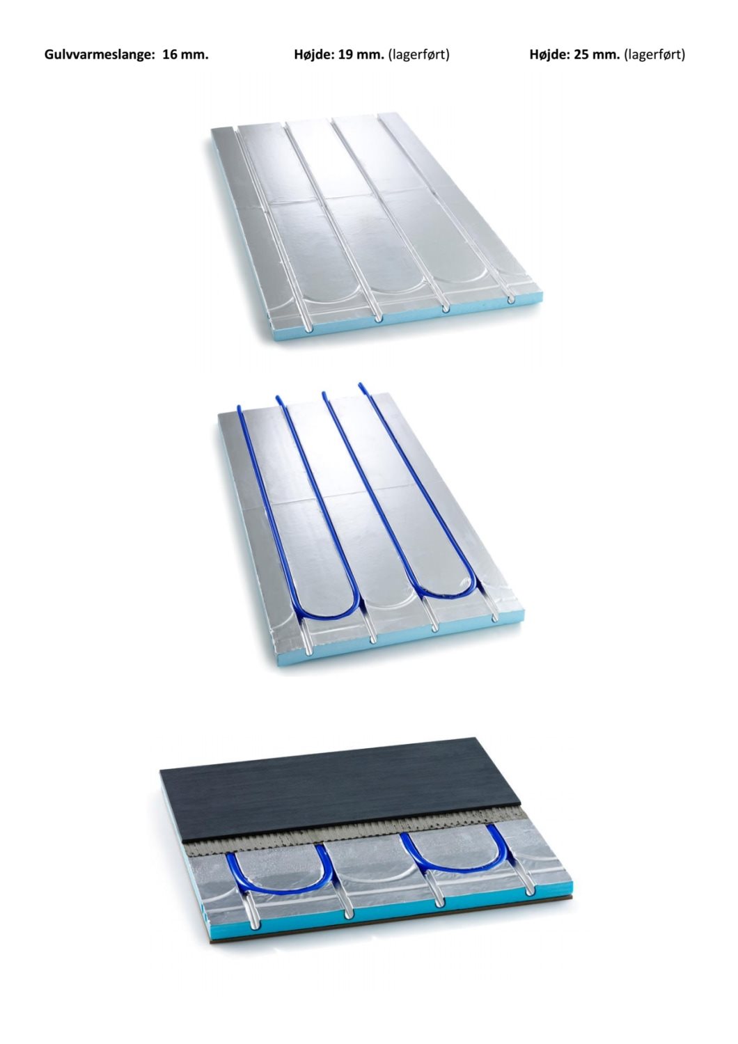 Pladerne vejer ca. 1 kg og leveres sammenbukket i mål 60 x 60cm, der giver en nem håndtering. Pladesystemet består af XPS300 isolering med pålimet aluminium der dækker hele pladen. En høj trykstyrke gør at du næsten kan anvende alle typer overgulve som fx laminat, trægulv, fliser eller klinker - se databladene for mere info.
