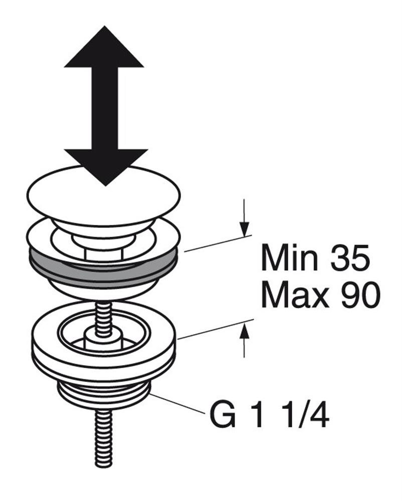 Push-down bundventil til håndvaske med overløb. Mål på håndvask: min 30 mm, max 45 mm.