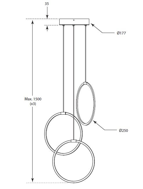 Med en maksimal ledningslængde på 1,5 meter pr. lysring er lampen fleksibel og passer perfekt over spisebordet, i stuen eller i en hall med højt til loftet.