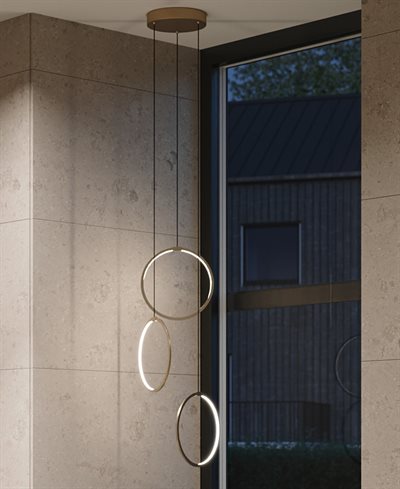 Halo pendlen er en stilfuld loftslampe, der skaber et imponerende visuelt udtryk med sine tre svævende LED-lys­ringe. Hver ring udsender et behageligt og jævnt lys, der giver rummet både funktionel belysning og en elegant atmosfære.