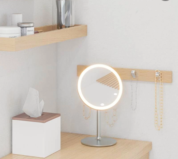 Handy makeupspejl på fod med 5 x forstørrelse, med lysstyring, USB, Ø180 mm