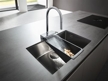 Aquno Select M81 køkkenvandhanen duperer en med den specielle flade og bløde stråletype SatinFlow, der er en verdensnyhed i køkkenbranchen. Den nederste del af armaturets krop fungerer her som ”bruser” for frugt og grønt: Tuden er bred og smal og skaber en stor vandstråle. En ny slags stråledyser sørger for en blød fordeling af vanddråberne, som du tydeligt kan mærke. Det betyder, at råvarerne kan skylles både grundigere og mere nænsomt. Med vandhanen følger en multifunktionssi, der passer perfekt under SatinFlow-strålen, så du let kan skylle fx mindre grøntsager og druer, uden de kommer i kontakt med vasken.