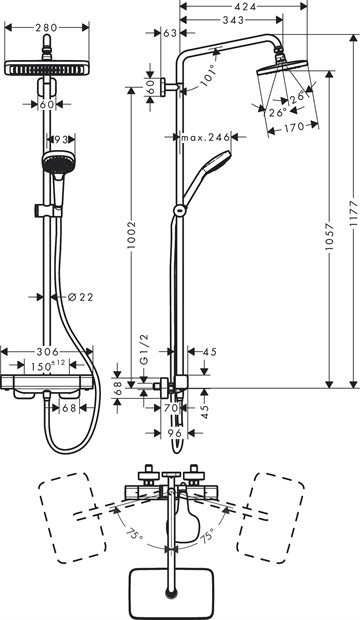 Her får du et komplet Hansgrohe brusesystem i flot design og god kvalitet. Brusearmaturet er med termostat og skoldningssikring, der giver tryghed og komfort. Blandingsbatteriets brusersæt består af stort brusehoved og håndbruser. Her er du garanteret en perfekt bruseoplevelse ved hvert brusebad.
