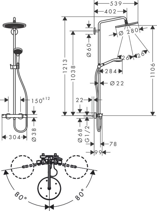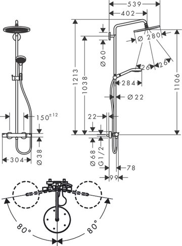 Imponerende og luksuriøst brusesystem med stor brusehoved på 280mm, der får hvert bad til at føles som en wellness og skøn oplevelse.