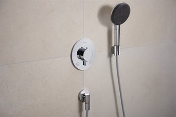 Hansgrohe Ecostat S indbygnings termostatarmaturet kommer med tydeligt definerede former og bløde rundekanter der passer perfekt ind i ethvert badeværelse. Det ultra tynde design giver mere plads i bruseområdet. Omdan dit badeværelse til en oase af selvforkælelse og velvære. Reguler din brusefornøjelse med et tryk på knappen. Omskiftningen mellem hoved- og håndbruseren sker på Ikonerne på brusearmaturet. Her er du garanteret en perfekt bruseoplevelse ved hvert brusebad. For at optimere oplevelsen er alle vandførende dele er lydisolerede (lydklasse 1)