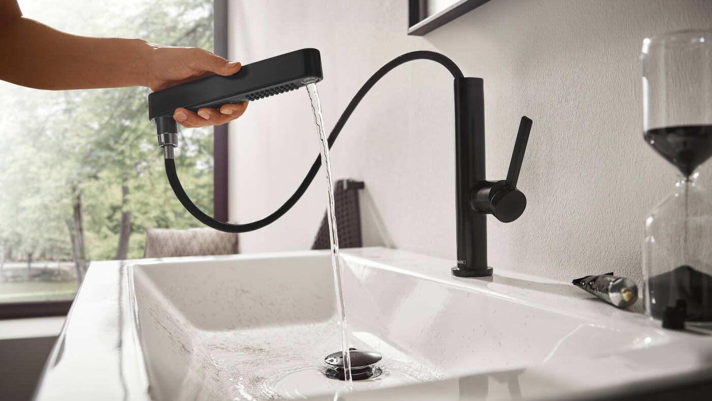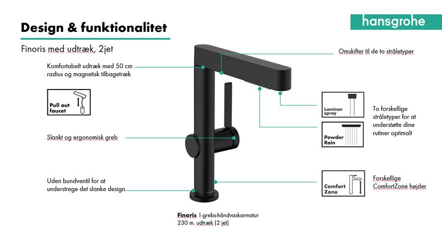 Hansgrohe Finoris er en nyskabende serie af vandhaner til håndvaske på badeværelset med multifunktionelle egenskaber. Designet er i velkendt minimalistisk stil, og håndvaskarmaturet er helt unikt med sin maksimale fleksibilit.