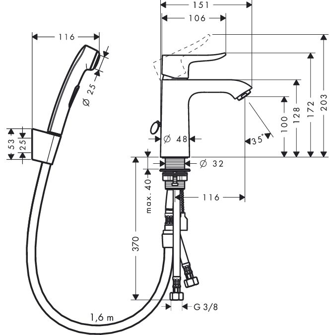 Hansgrohe Metris håndvaskarmatur, M. bidettebruser & 160 cm bruserslange, Krom