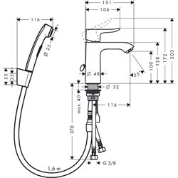 Hansgrohe Metris  håndvaskarmatur, M. bidettebruser & 160 cm bruserslange, Krom