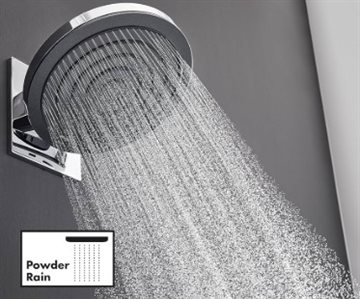 PowderRain er en mikrodråbeteknologi, hvor der er seks åbninger pr. brusedyse i stedet for blot en. Resultatet er dråber som er lettere og som føles silkebløde på huden samtidig med at de indkapsler hele kroppen med vand millimeter for millimeter. Her er du garanteret en perfekt bruseoplevelse ved hvert brusebad.