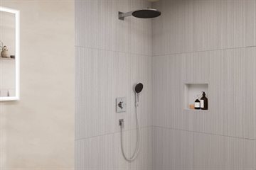 Med dette termostat indbygningsbrusebatteri med omskifter (2 udtag) fra hansgrohe model showerSelect Comfort S kan vandet ledes to steder hen, til en hovedbruseren og eller håndbruseren.